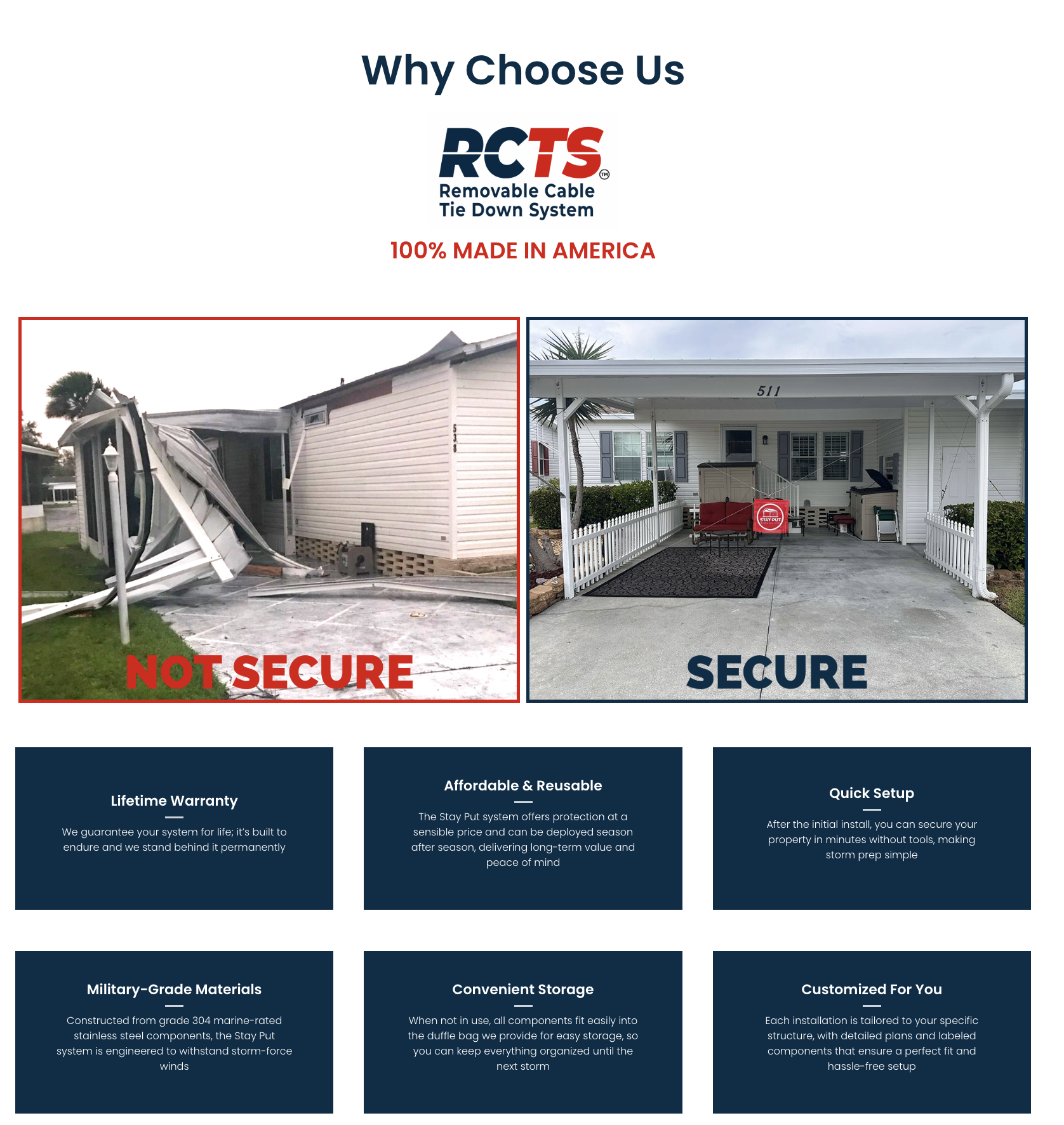 Stay Put Storm Solutions needed a web presence that quickly explained a technical product, built trust in a high-stakes category, and reduced friction for visitors who were ready to reach out. Their audience often discovers the brand in the context of looming storms, so the experience had to be clear, fast, and action-oriented on both desktop and mobile.